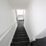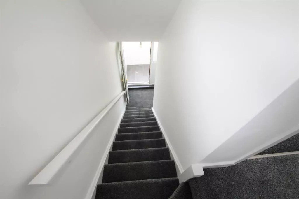 Stairs leading to the first floor with two good sized bedrooms and a fully tiled modern family bathroom with white suite, over bath shower and heated towel rail.