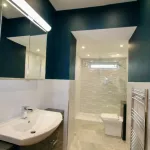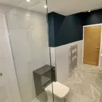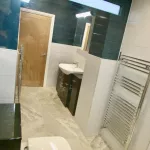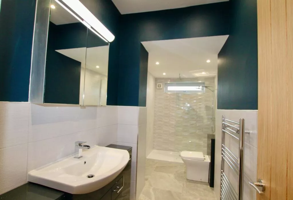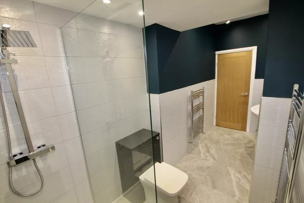 New fully tiled modern bathroom with heated towel rail, walk-in shower cubicle with over-head rain shower.